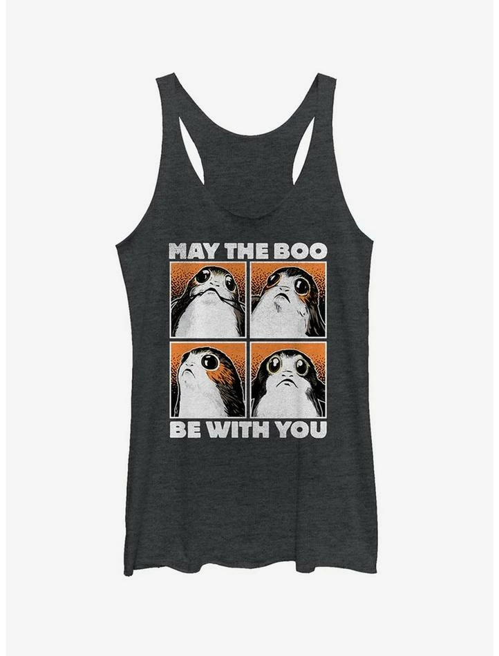 Trick or tweet with your favorite little birds on the Star Wars Halloween Porg Boo With You Women’s Racerback Tank Top. A panel of Porgs is framed by “May the Boo Be With You” on this funny Halloween tank top.