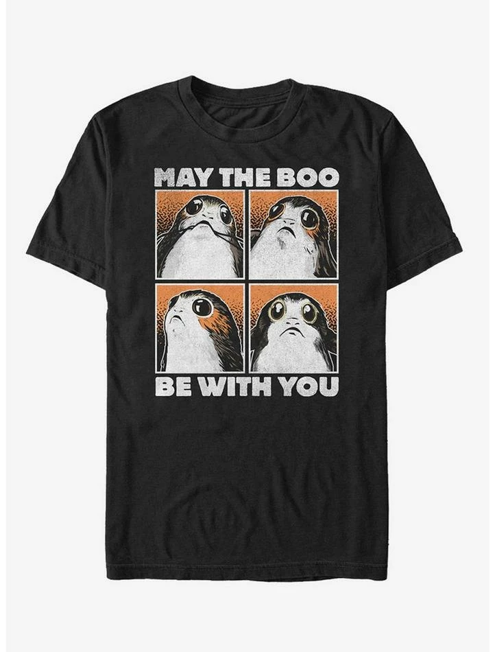 Trick or tweet with your favorite little birds on the Star Wars Halloween Porg Boo With You Men’s T-Shirt. A panel of Porgs is framed by “May the Boo Be With You” on this funny Halloween shirt.
