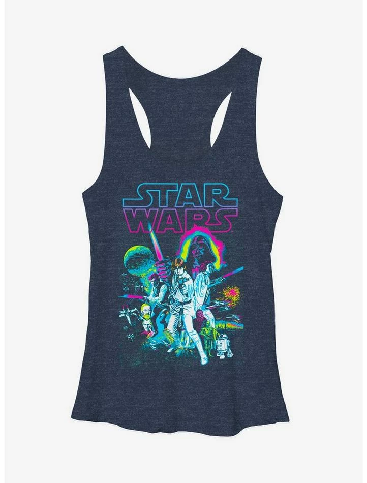 Relive the excitement of when the first Star Wars film was released with the Star Wars A New Hope Heather Navy Blue Racerback Tank Top. This soft and breathable top features the artwork from one of the original Star Wars posters printed in bright colors. 50% Polyester, 25% Cotton, 25% Rayon.