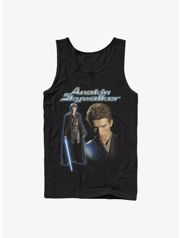 Rep the Chosen One with this Star Wars tank. It features the dude who eventually becomes Darth Vader — Anakin Skywalker in Episode II: Attack of the Clones — holding a lightsaber.
