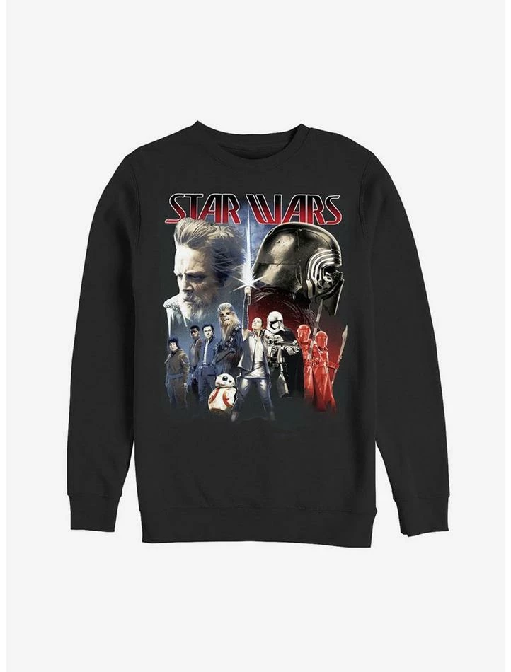 A Jedi knows there must be balance between the Dark and the Light, especially when it comes to the Star Wars The Last Jedi Black Sweatshirt! Luke Skywalker and Kylo Ren are front and center on this black Episode 8 sweatshirt, while members of the First Order and the Resistance stand beneath them. 50% Cotton, 50% Polyester.