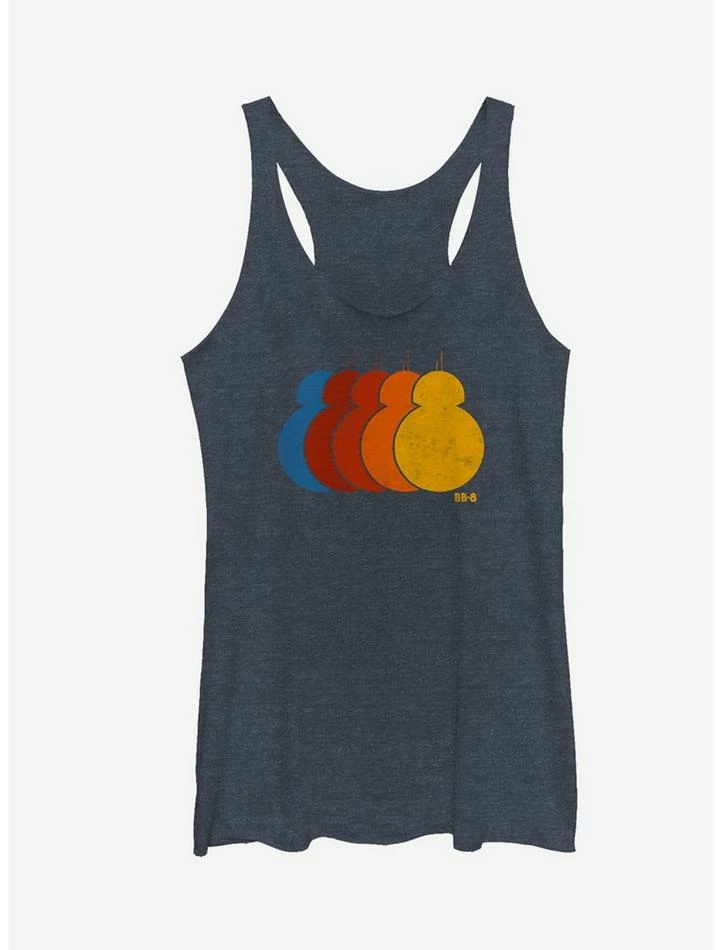 Looking for a cool new Star Wars Episode 7 shirt? Check out the Star Wars BB-8 Retro Rainbow Heather Navy Blue Racerback Tank Top! A distressed vintage-style print on the front of this cool BB-8 shirt features the outline of BB-8 printed five times in an array of colors. 50% Polyester, 25% Cotton, 25% Rayon.