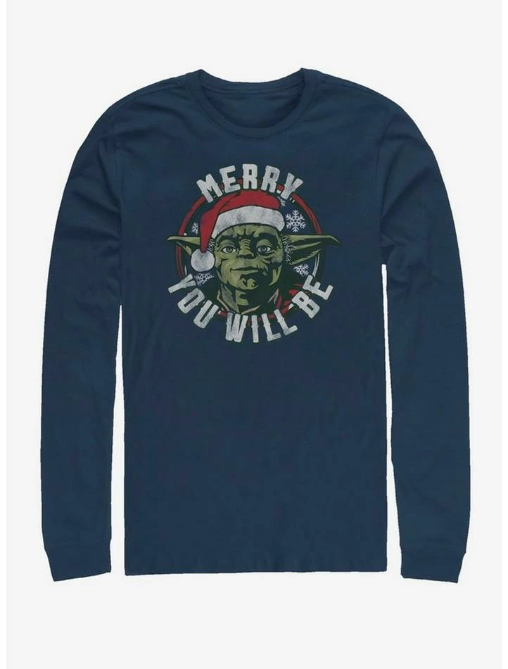 Green and red all over! This long-sleeved bavy blue Star Wars tee features Yoda in a Santa hat, with “Merry You Will Be” verbiage surrounding him. Holiday ready, you are.