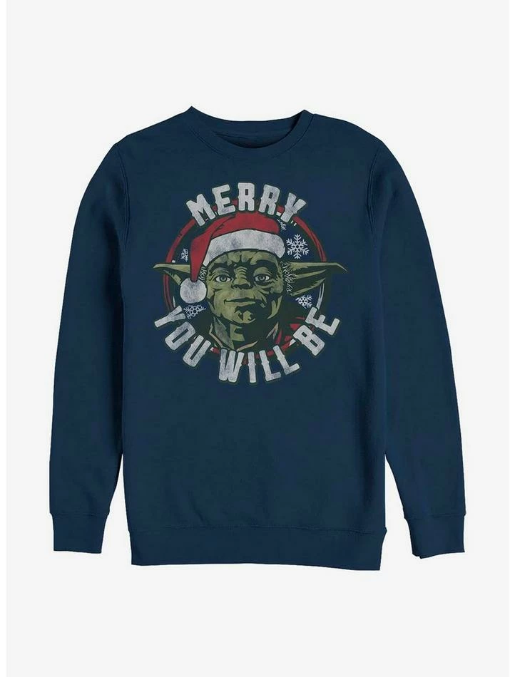 Green and red all over! This navy blue crewneck Star Wars sweatshirt features Yoda in a Santa hat, with “Merry You Will Be” verbiage surrounding him. Holiday ready, you are.