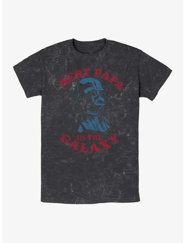 Not your typical father figure! The galaxy’s most famous dad, Darth Vader, is printed on this cool mineral washed Star Wars Father’s Day shirt with “Best Papa in the Galaxy” encircling him in slightly distressed print.