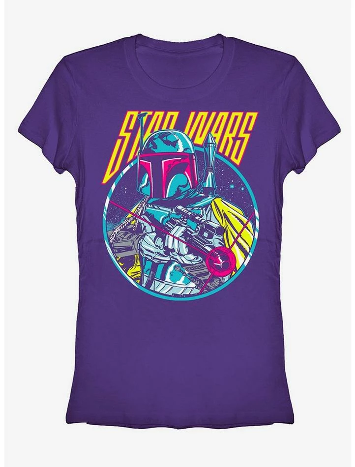 Check out the galaxy’s top bounty hunter in action with the Star Wars Boba Fett Blaster Purple T-Shirt. This expert gunman is shown wielding a blaster on the front of a fitted purple graphic tee, with “Star Wars” printed above. 100% Cotton. Runs small, size up.