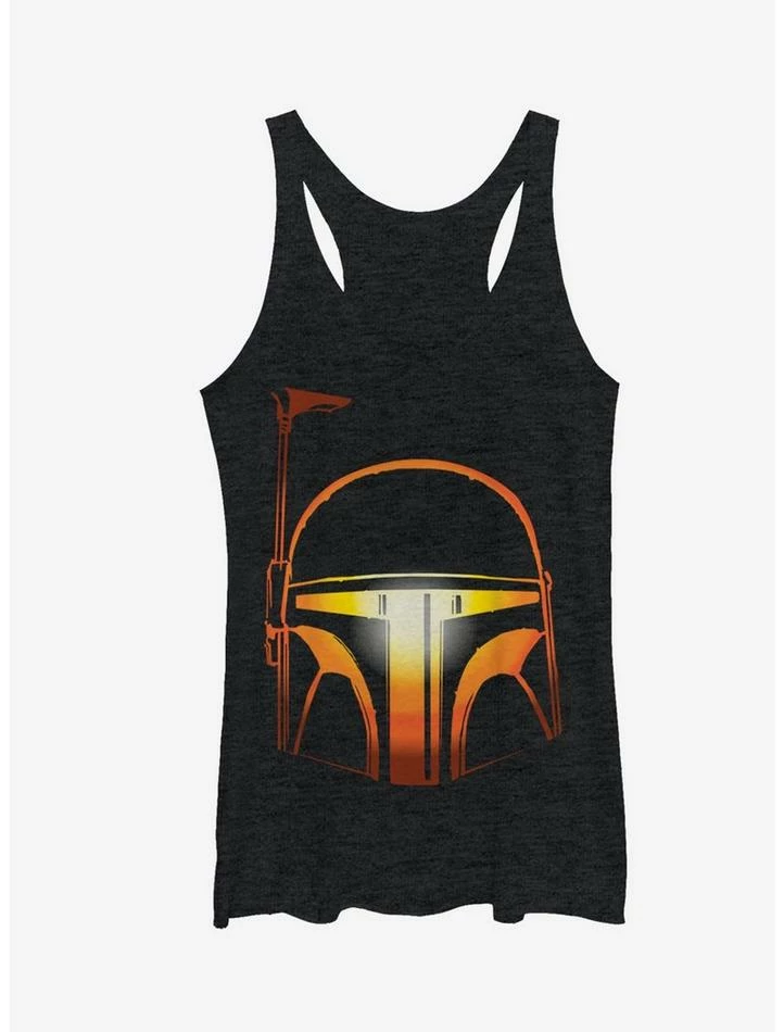 The most wanted shirt in the galaxy is the Star Wars Boba Fett Halloween Jack-O’-Lantern Heather Black Racerback Tank Top! An image of Boba Fett’s helmet printed on the front of this awesome black Star Wars Halloween shirt features shades of orange and yellow to mimic the glow of a jack-o’-lantern. 50% Polyester, 25% Cotton, 25% Rayon. Designed with raw-edge hems.