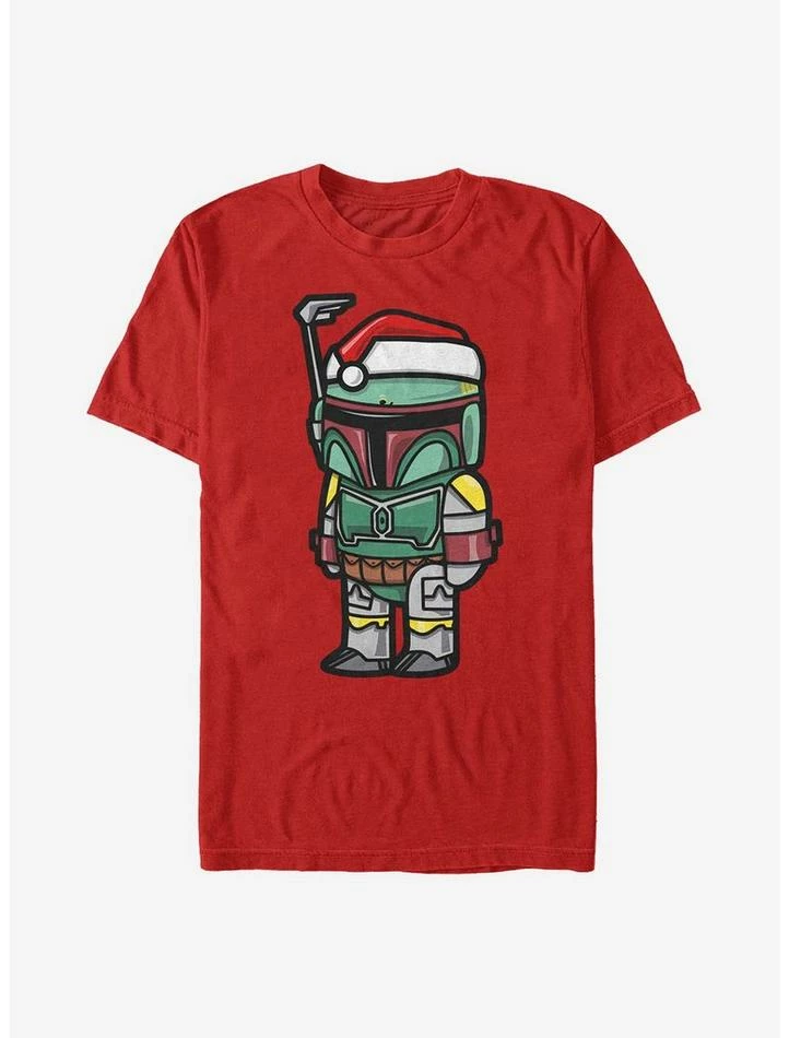 Bring us that Christmas bounty! This red, holiday-themed Star Wars tee features Boba Fett in a Santa hat.