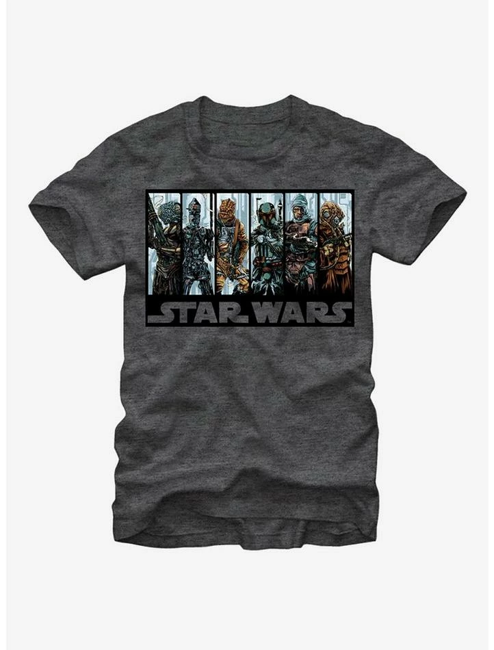 Join the legion of fiercely independent mercenaries hunting throughout the galaxy. Six bounty hunters from the Star Wars universe, including the infamous Boba Fett, are printed above the Star Wars logo on this durable charcoal shirt.ย