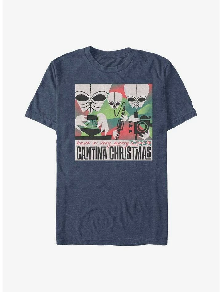 Wishing you a very merry Cantina Christmas! This heathered navy blue Star Wars tee is the perfect shirt for your next holiday party. It features members of Figrin D’an and the Modal Nodes on a red and green background.