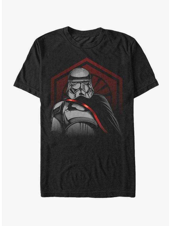 Show your allegiance to General Hux with the Star Wars Captain Phasma First Order Cape Black T-Shirt. A distressed print on the front of this cool black Captain Phasma T-shirt features the First Order emblem behind Captain Phasma rocking her silver armor and a cape. 100% Cotton.