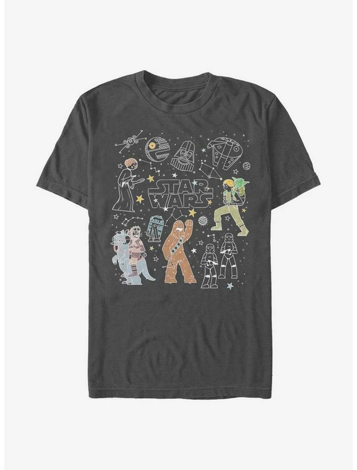 You don’t need a telescope to spot the constellations on this shirt! Our lightweight blackΒ Star Wars tee features starry versions of Luke, Leia, Yoda, R2-D2, Chewbacca, Darth Vader and more.