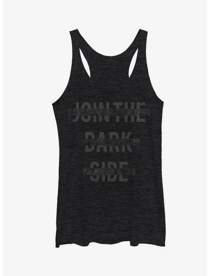 Start down the path to the dark side with the Star Wars Censored Join the Dark Side Heather Black Racerback Tank Top. Bold black letters with a strike through the middle spell out “Join the Dark Side” on the front of this epic black Star Wars tank top worthy of a Sith Lord. 50% Polyester, 25% Cotton, 25% Rayon. Designed with raw-edge hems.