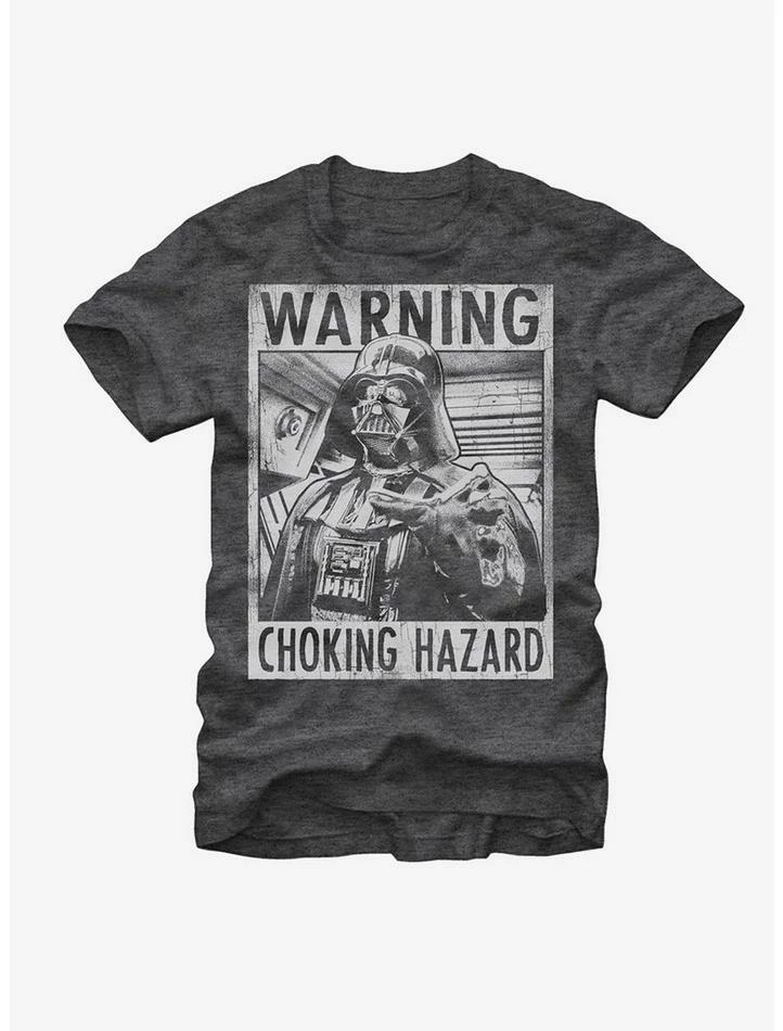 This heathered charcoal grey Star Wars tee is here to warn all the admirals in the Empire that they just might be in for a deadly surprise. “Warning Choking Hazard” is printed around a black and white image of Darth Vader reaching out to Force choke someone.