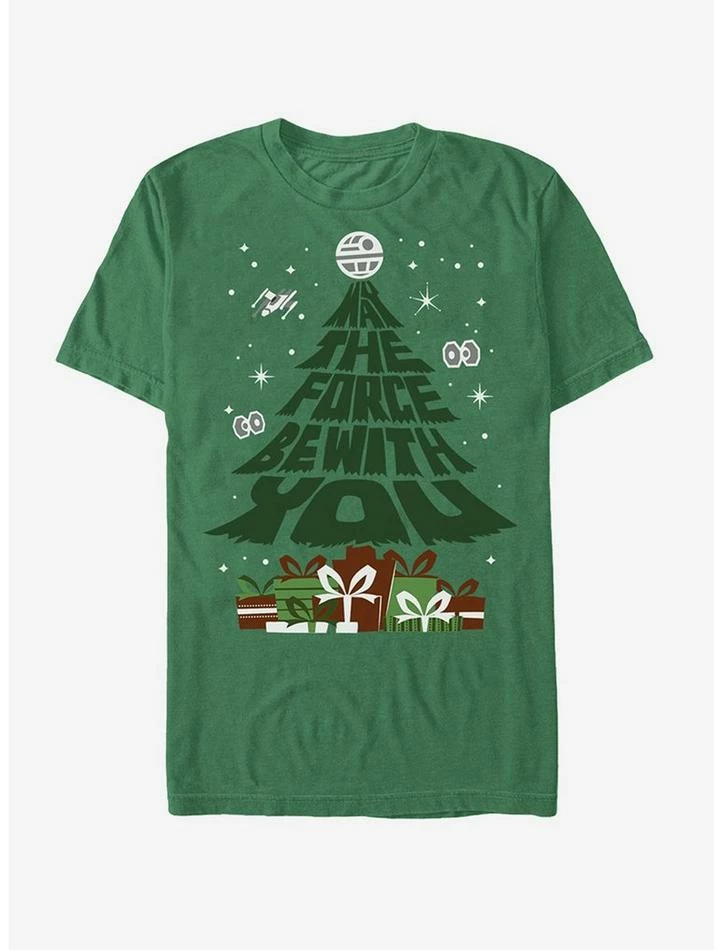 This holiday season, stick to the gift that keeps on giving: the Star Wars May the Gifts Be With You Kelly Green T-Shirt! The Death Star sits atop a Christmas tree that spells out “May the Force Be With You” printed on the front of this awesome green Star Wars Christmas shirt. 100% Cotton.