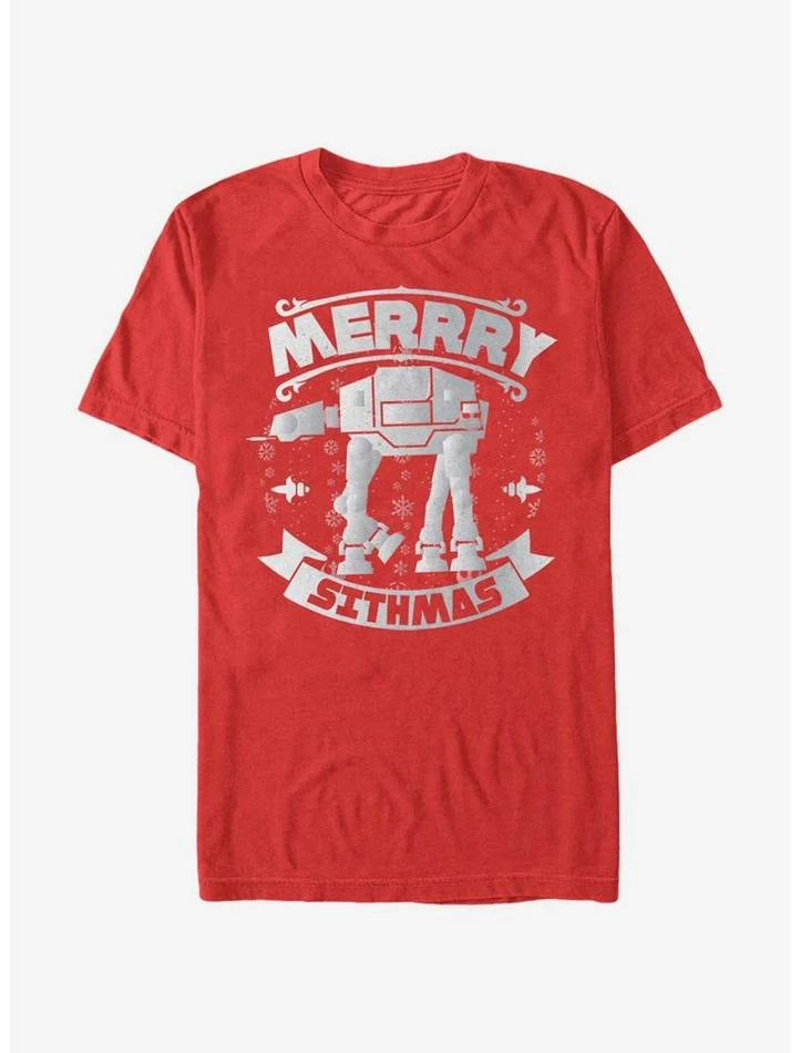 Throw on your Star Wars Christmas Sithmas AT-AT Red T-Shirt and saddle up the AT-ATs because Santa needs help pulling his sleigh! An AT-AT walks across this red Christmas shirt with “Merry Sithmas” encircling it for the perfect holiday style. 100% Cotton.