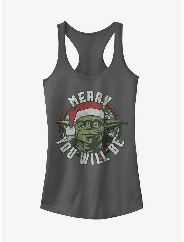It’s time to make the season bright with your favorite Jedi Master and the Star Wars Christmas Yoda Merry You Will Be Juniors’ Racerback Tank Top! A cartoon Yoda wearing a Santa hat is encircled by the distressed text “Merry You Will Be” on this funny fitted Star Wars Christmas tank top.