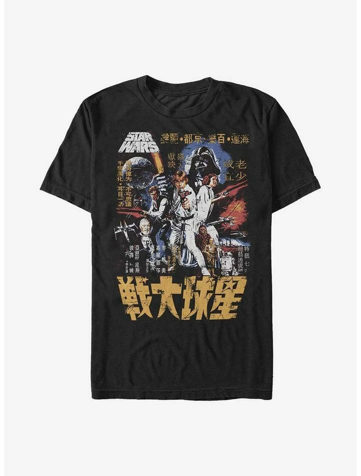 The Star Wars love is EVERYWHERE. This lightweight black tee features vintage movie poster art featuring Luke Skywalker, Princess Leia Organa, Darth Vader and more — with a Japanese twist.