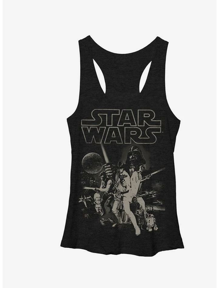 Luke Skywalker, Princess Leia, Han Solo, Darth Vader, and all the rest of your favorite Star Wars characters are featured on the Star Wars Classic Poster Heather Black Racerback Tank Top. This cool black shirt has one of the original Star Wars poster designs printed in front for a fun throwback style. 50% Polyester, 25% Cotton, 25% Rayon. Designed with raw-edge hems.