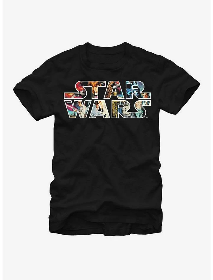 Darth Vader, Luke Skywalker, and Princess Leia are just a few of the awesome characters featured on the Star Wars Classic Poster Logo Black T-Shirt. The Star Wars logo is printed across the front of this black graphic tee with some of the original poster artwork filling the letters to create a vintage feel. 100% Cotton.