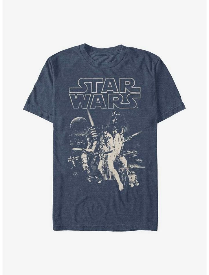 Β No need to look in a galaxy far, far away to spruce up your style. This awesome graphic tee, inspired by the poster art forΒ Star Wars: Episode IV – A New Hope, is easily obtained. It features iconic characters like Luke Skywalker, Princess Leia, Han Solo, Darth Vader and more.