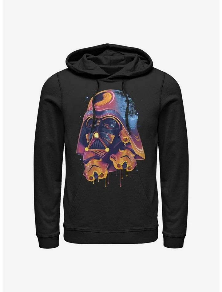 We find your lack of new Star Wars hoodies disturbing. This black hooded pullover has pouch pockets and features a colorful Darth Vader and Death Star mashup melting.