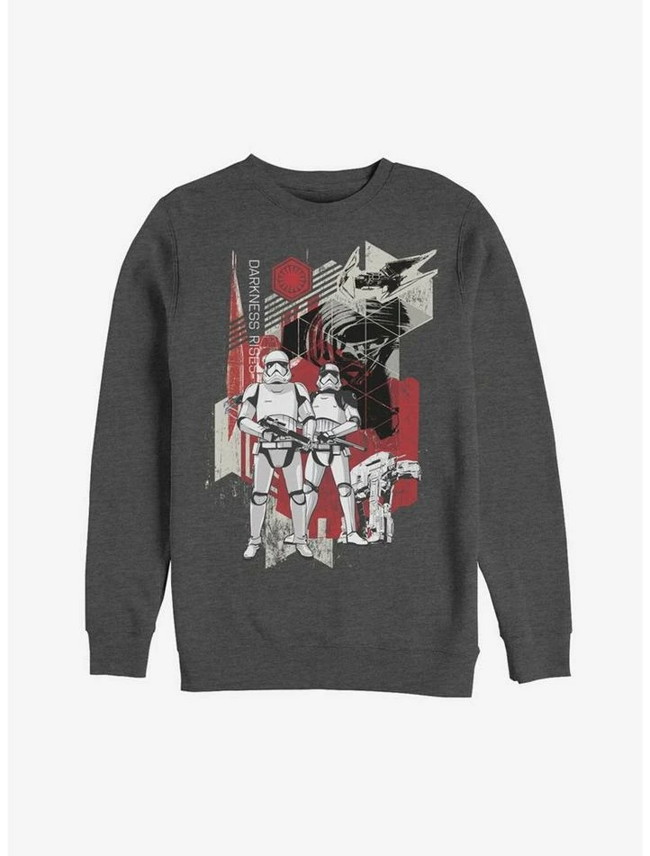 Be bad to the bone and join the First Order in the Star Wars The Last Jedi Darkness Rises Heather Charcoal Sweatshirt! Stormtroopers stand on this awesome gray Episode 8 sweatshirt that has Kylo Ren’s mask and red and white geometric designs alongside the text “Darkness Rises” in the background. 50% Cotton, 50% Polyester.