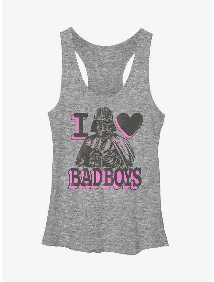 Don’t underestimate the Star Wars Darth Vader Bad Boy Heather Gray Racerback Tank Top; it’s got charm that’s hard to resist! Darth Vader is featured on the front of this soft gray shirt with “I Love Bad Boys” printed in pink and black around him. 50% Polyester, 25% Cotton, 25% Rayon.