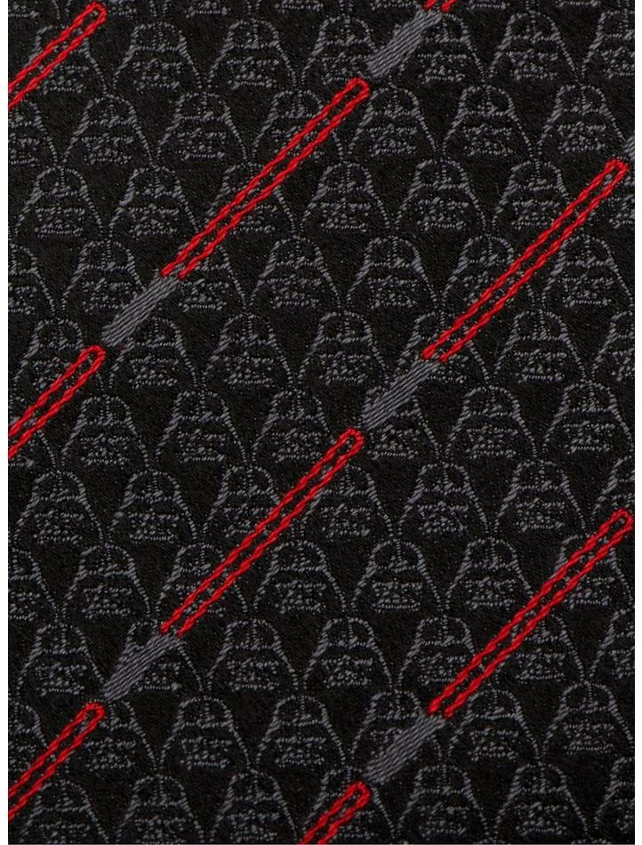 This 100% woven silk Star Wars tie utilizes Darth Vader’s lightsaber to form a red diagonal stripe pattern on a black ground. And there’s more?the black background features a tight repeated tonal pattern of Darth Vader’s helmet. Come to the Dark Side without compromising your style with the Darth Vader Black Lightsaber Stripe Tie. Approximately 59″ x 3″, 100% silk. Officially licensed by Lucasfilm LTD.