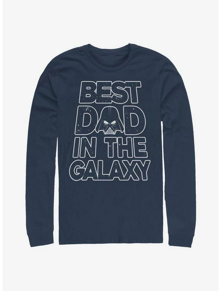 Good thing you have the best dad in the galaxy — ’cause Luke Skywalker certainly doesn’t! This navy blue long-sleeved Star Wars tee celebrates all the dads with its Darth Vader helmet-accented design.