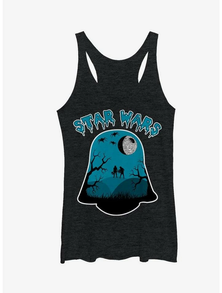 Ghosts and ghouls from across the galaxy are raving about the Star Wars Darth Vader Helmet Halloween Heather Black Racerback Tank Top! The shape of Darth Vader’s helmet printed on this unique black Star Wars shirt features a Halloween scene with the Death Star, X-Wing fighters, and a couple of trick-or-treaters. 50% Polyester, 25% Cotton, 25% Rayon.