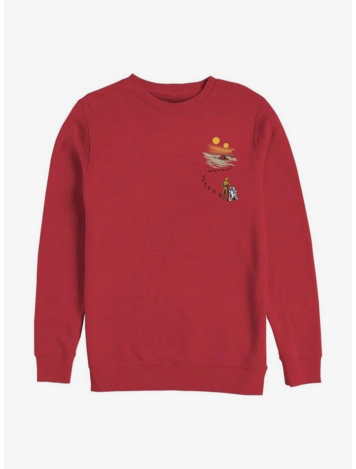 Our red crewneckΒ Star Wars sweatshirt captures the iconic scene in Episode IV – A New Hope where droids C-3PO and R2-D2 make their way through the deserts of Tatooine. Watch out for those Jawas!