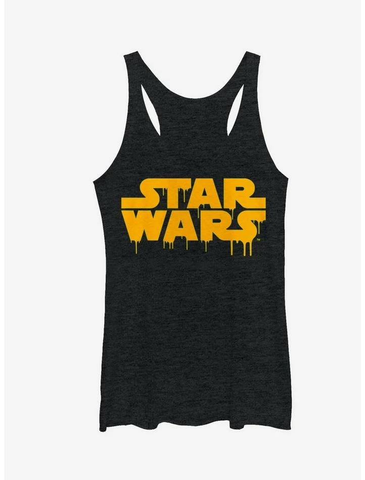 Lurking in the outer reaches of the galaxy lies a spooky surprise: the Star Wars Dripping Halloween Logo Heather Black Racerback Tank Top! A spooky version of the Star Wars logo appears to ooze in a fun Halloween-themed print on the front of this unique black Star Wars shirt. 50% Polyester, 25% Cotton, 25% Rayon.