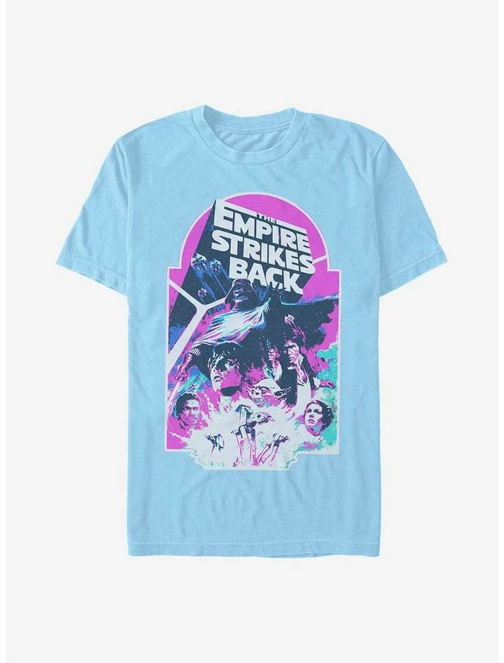The battle continues! This light blue graphic tee features a pink and teal front screen inspired by Star Wars: Episode V – The Empire Strikes Back featuring Luke Skywalker, Princess Leia, Han Solo, Lando Calrissian, Yoda, Darth Vader and more.