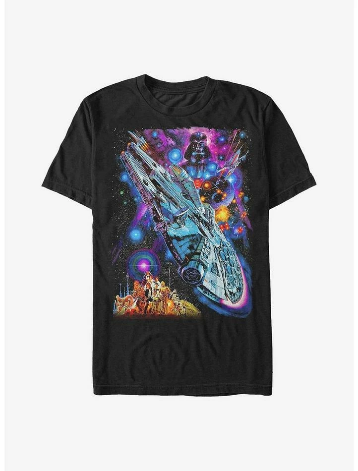 The Millennium Falcon soars through the center of this lightweight black Star Wars tee — that also features iconic characters from the original trilogy like Darth Vader, Luke Skywalker, Princess Leia, Han Solo, Chewbacca, C-3PO, R2-D2 and more.
