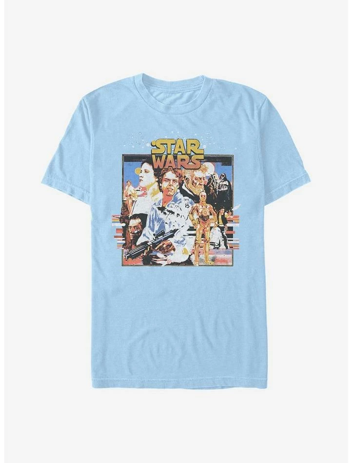 Epic images — and beloved characters like Luke Skywalker and Obi-Wan Kenobi — appear in one out-of-this-world collage on this light blue poster-inspired Star Wars: Episode IV – A New Hope tee.
