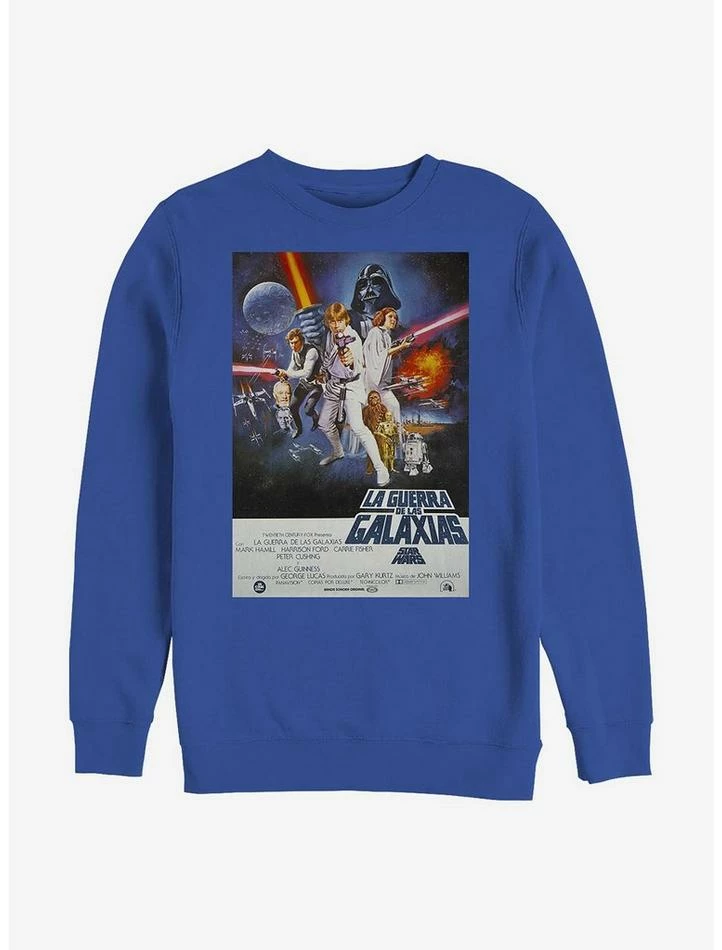 Star Wars is a worldwide phenomenon. This crewneck sweatshirt is proof! It features vintage poster art for Episode IV of the Star Wars saga — La Guerra de las Galaxias.