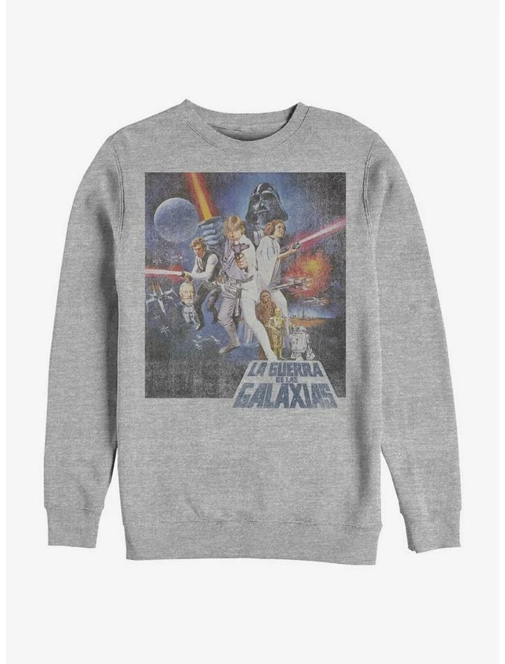 Star Wars is a worldwide phenomenon. This crewneck sweatshirt is proof! It features vintage poster art for Episode IV of the Star Wars saga — La Guerra de las Galaxias.
