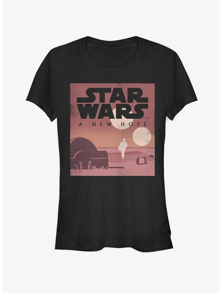 From Tatooine to you. This fitted black graphic tee — inspired by Star Wars: Episode IV – A New Hope — features a scene from Luke Skywalker’s home planet in a minimalist design.