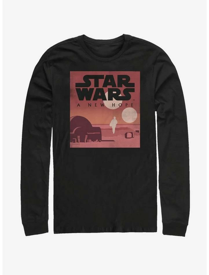 From Tatooine to you. This black long-sleeved graphic tee — inspired by Star Wars: Episode IV – A New Hope — features a scene from Luke Skywalker’s home planet in a minimalist design.