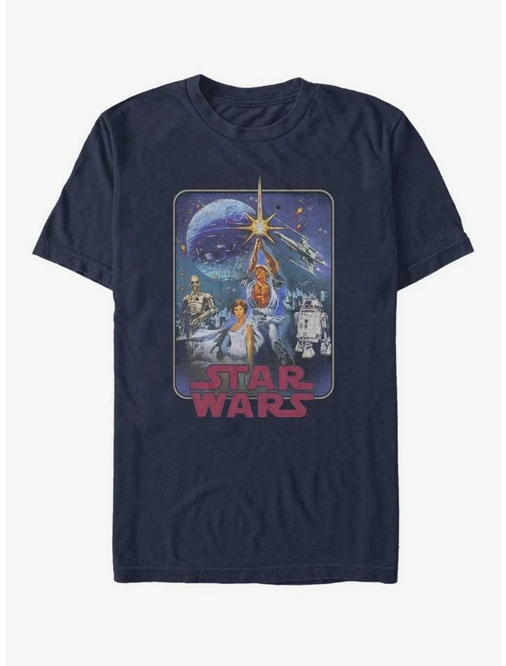 The Star Wars legacy lives on! This navy blue graphic tee features poster art inspired by A New Hope — y’know, the one with Luke hoisting a lightsaber above his head.