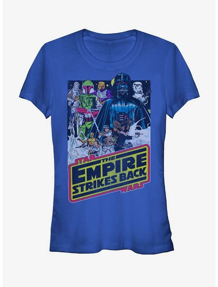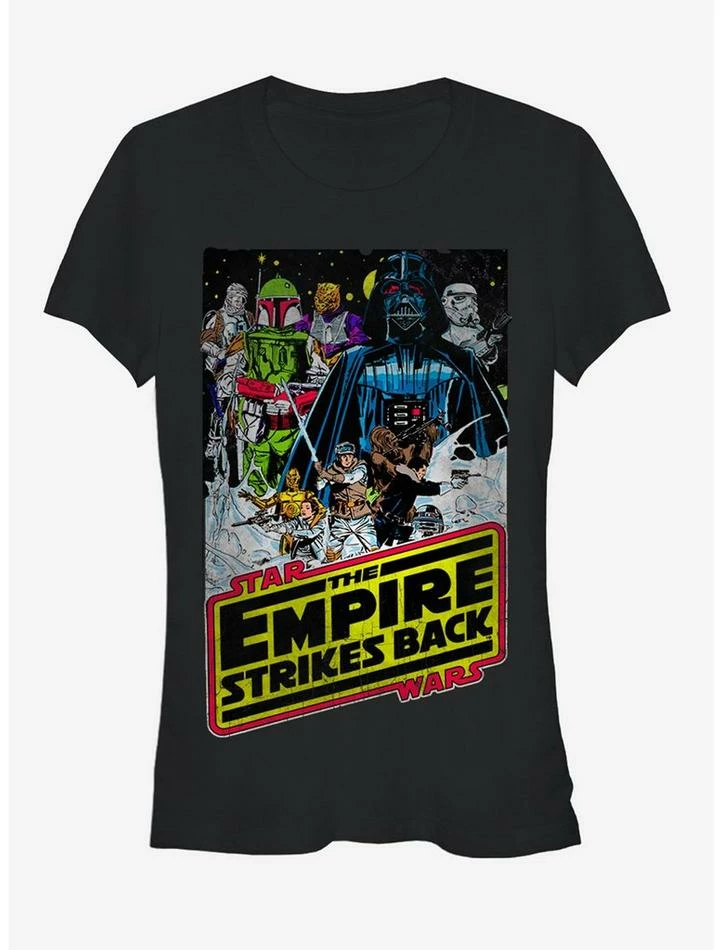 Celebrate the second film from the original Star Wars trilogy with the Star Wars Empire Strikes Back Black T-Shirt. Some of your favorite Star Wars characters such as Darth Vader, Boba Fett, and Chewbacca are printed with scenes from the planet Hoth above the Empire Strikes Back logo on a slim fit black top. 100% Cotton.