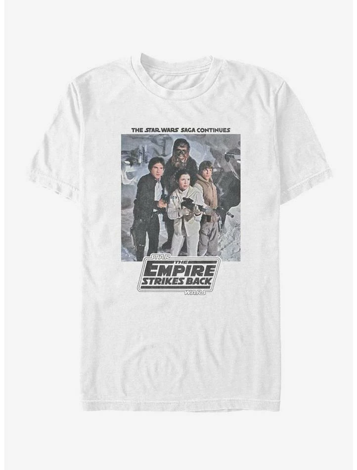 Squad goals! This lightweight white tee features a classic photo of Han Solo, Princess Leia, Luke Skywalker and Chewbacca. “The Star Wars Saga Continues” verbiage above — and Star Wars – The Empire Strikes Back logo below.