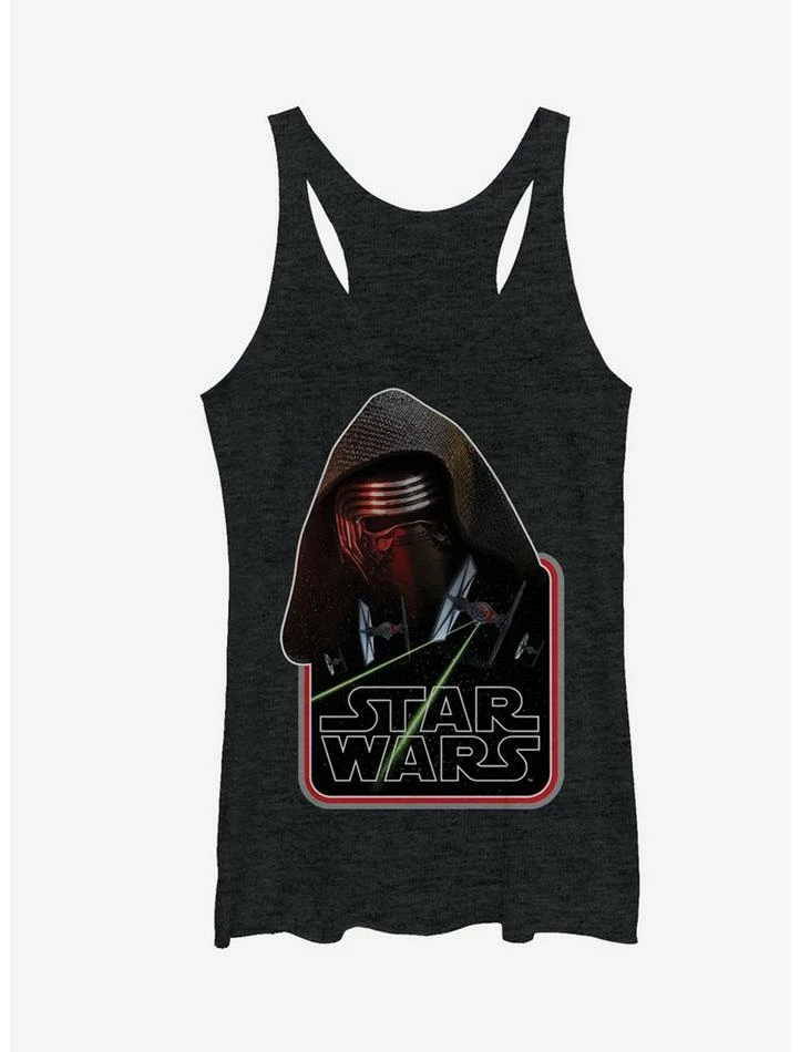 Don’t be afraid of the dark side of the Force, embrace it with the Star Wars Episode VII Kylo Ren TIE Fighter Heather Black Racerback Tank Top! Kylo Ren stares intently on the front of this black Star Wars Episode VII shirt with a TIE fighter zooming into action above the Star Wars logo. 50% Polyester, 25% Cotton, 25% Rayon.
