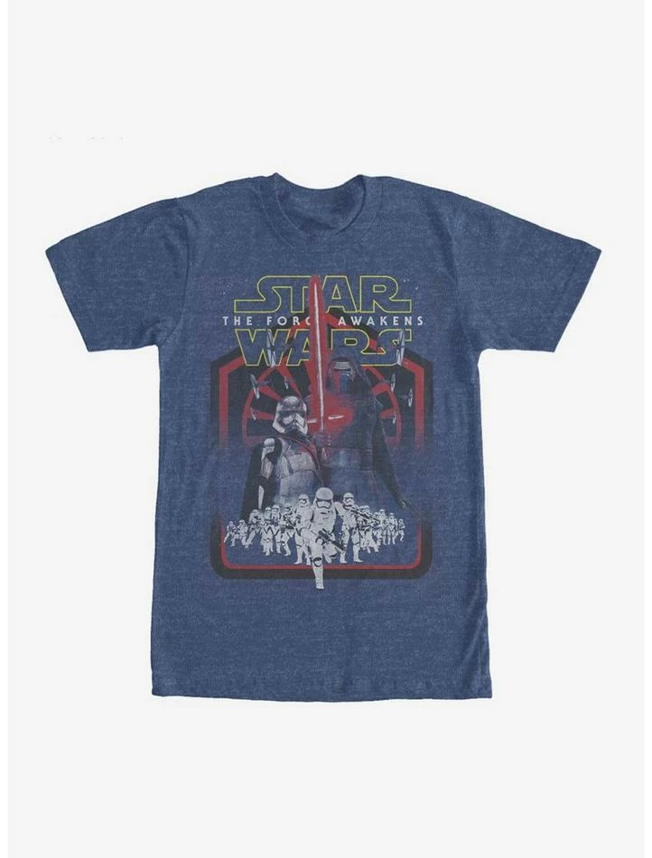 Episode VII embraces a classic look with the Star Wars The Force Awakens Kylo Ren and Stormtroopers Heather Navy Blue T-Shirt. This awesome navy tee features a lightly distressed print for a vintage style that features The Force Awakens logo next to Kylo Ren, Captain Phasma, and a squad of stormtroopers. 60% Cotton, 40% Polyester.