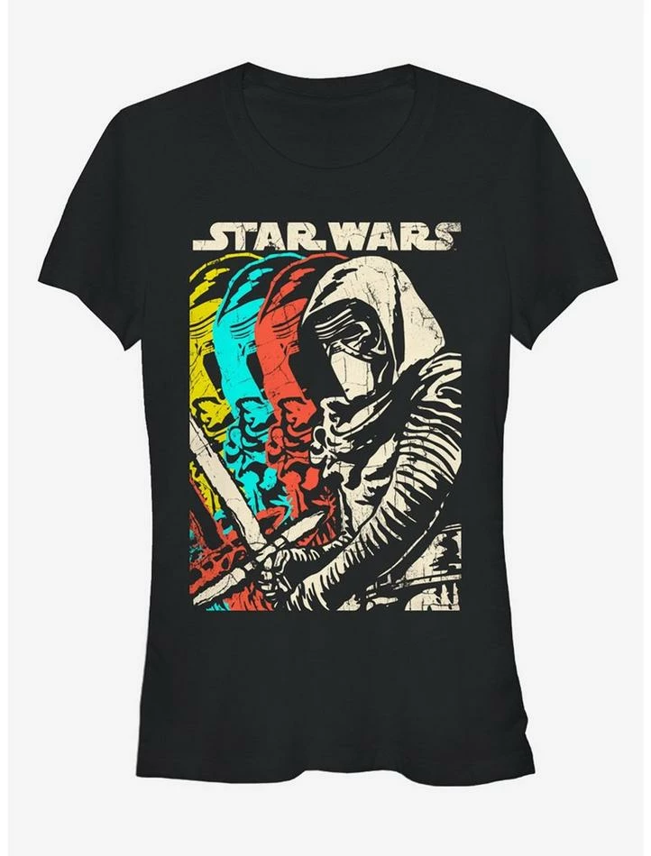 Why settle for one villain when you can get four versions of Kylo Ren lined up on the Star Wars Episode VII: The Force AwakensΒ Kylo Ren Copies Black T-Shirt? An edgy distressed print on the front of this epic black Star Wars Episode VII shirt shows Kylo Ren holding his lightsaber below the classic Star Wars logo. 100% Cotton.