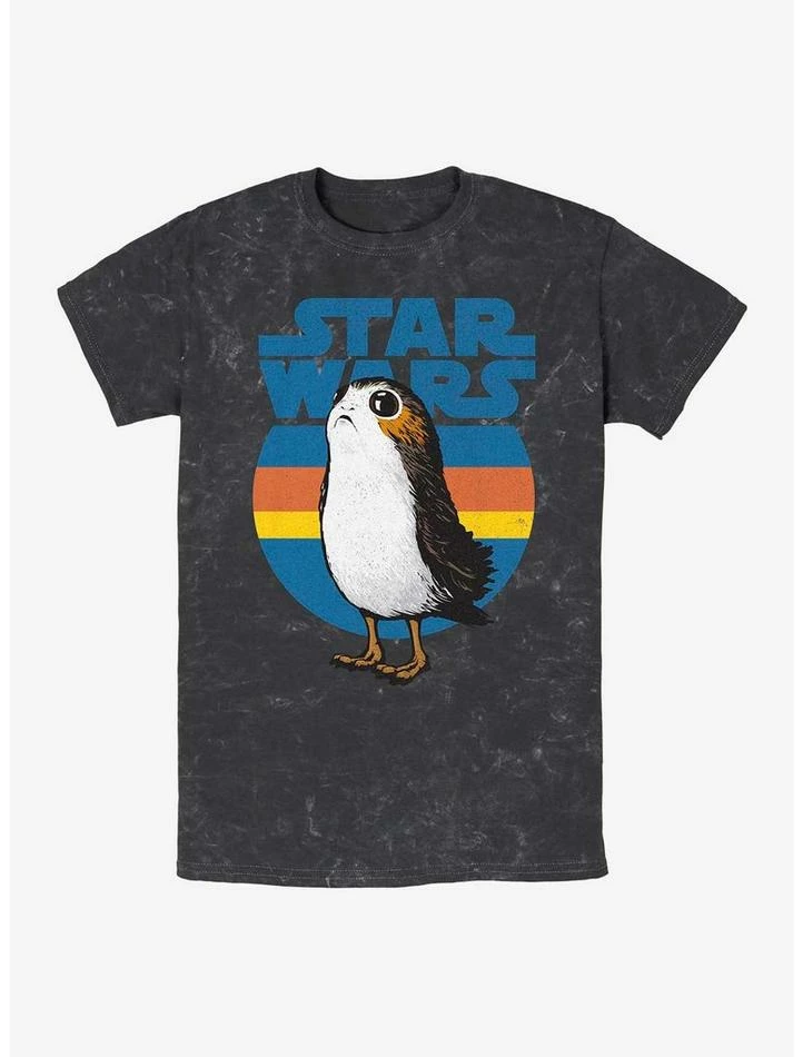 May the Porg be with you! This black mineral washed tee has a blue Star Wars logo above an image of the big-eyed, beakless bird.