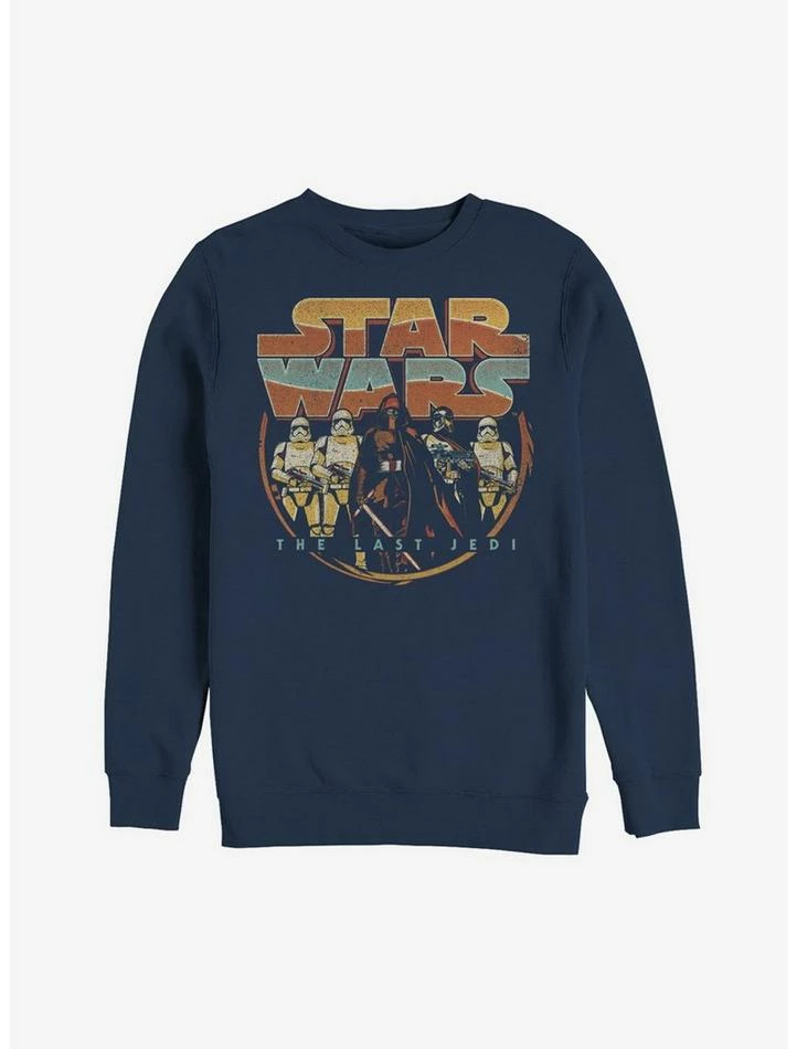 Don’t be fooled by those stormtrooper suits, even the First Order enjoys a throwback style like the Star Wars The Last Jedi First Order Retro Navy Blue Sweatshirt! The masked Kylo Ren is flanked by his First Order army of stormtroopers, while “Star Wars The Last Jedi” encircles them in a cool ombre retro style down the front of this blue Episode 8 sweatshirt. 50% Cotton, 50% Polyester.