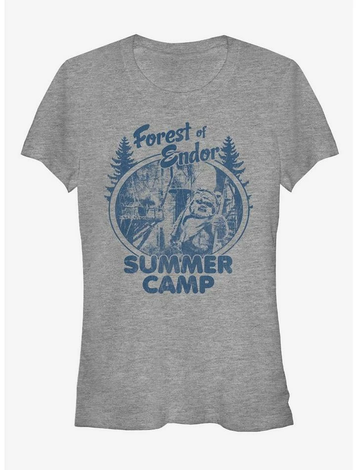 This summer, join your pals Wicket, C-3PO, and Princess Leia with the Star Wars Forest of Endor Summer Camp Heather Gray T-Shirt! A distressed navy blue print on the front of this funny Ewok shirt reads “Forest of Endor Summer Camp” next to the famous Ewok Wicket standing near his village. 90% Cotton, 10% Polyester.
