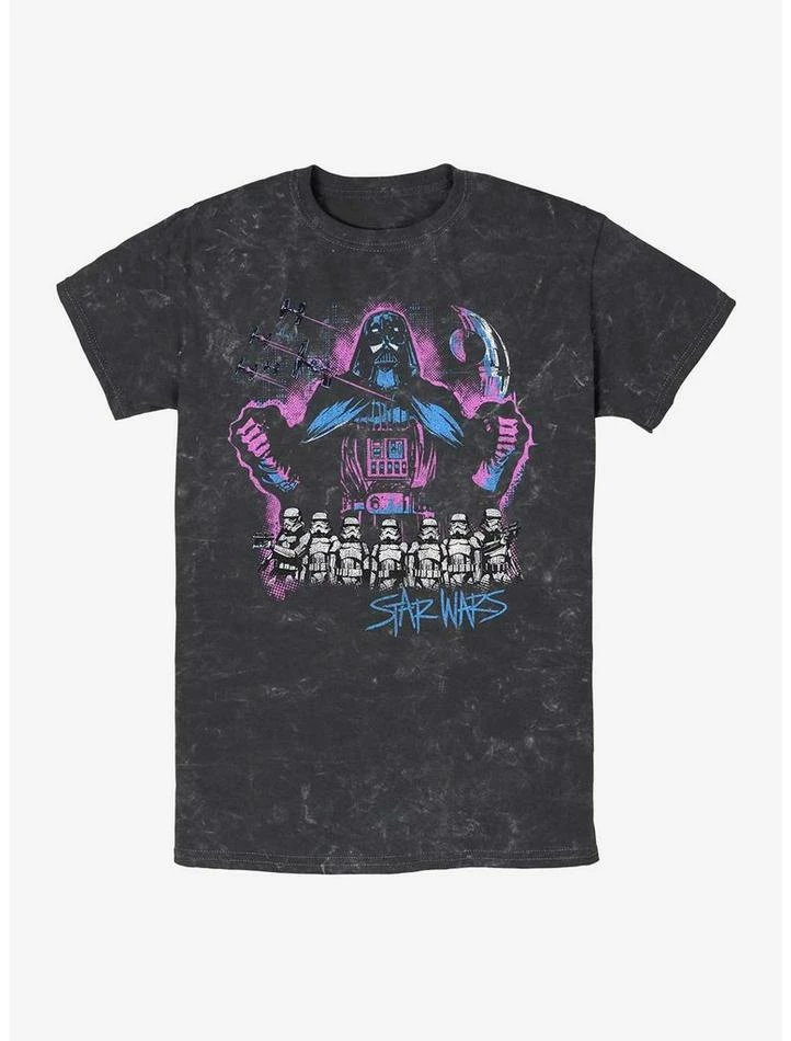 Long live the Empire! This black mineral washed Star Wars tee features an imposing Darth Vader and his Stormtroopers below the Death Star and TIE fighters.